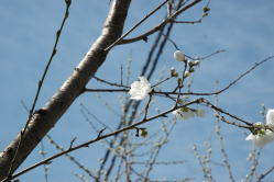 左下写真はボケの花、右下は昨年より15日早く開花した白桃の花。桜は全国で2番目に早い17日の予定です。